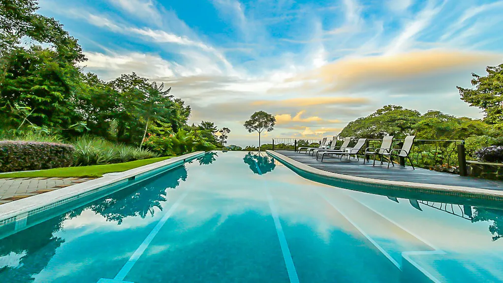 The pool uses saltwater chlorination, which is gentler on skin and more sustainable long-term. Embedded lighting and self-cleaning systems minimize maintenance in a high-humidity environment.